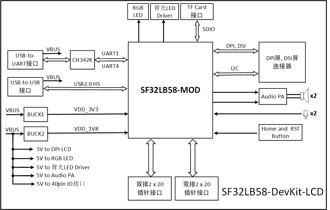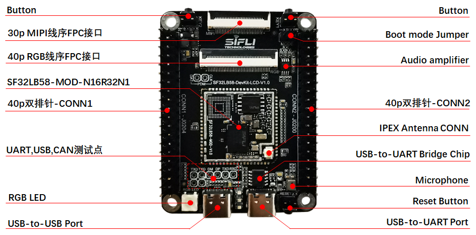 SF32LB58-DevKit-LCD is a development board based on the SF32LB58-MOD module, primarily used for developing various applications with displays via DSI, DPI, and QSPI interfaces.