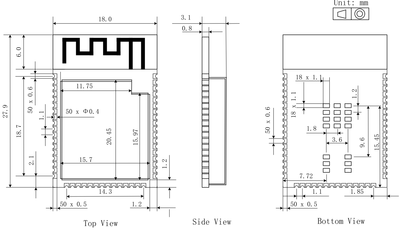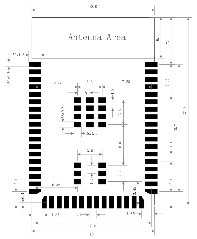 SF32LB52-MOD-1系列模组,采用3边LCC半孔和底部LGA焊盘,板载PCBA蓝牙天线的设计,尺寸:18 x 27.9 x 3.1mm。