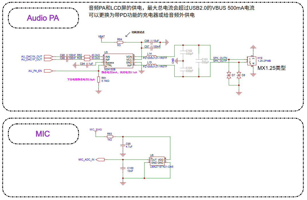 模组支持1路单端模拟mic输入和1路差分音频输出。