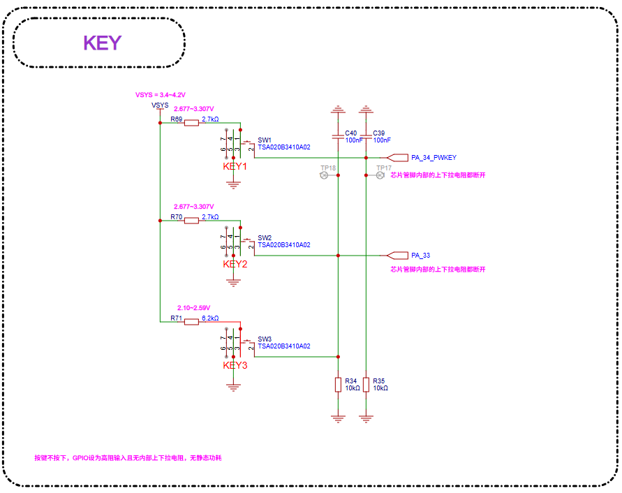 模组支持GPIO按键和GPADC按键。PA34支持长按10s左右重启功能,推荐用做开关机按键。