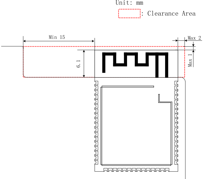如果天线无法伸出板边,请保证给PCB天线一个足够大的净空区域(严禁铺铜、走线、摆放元件),该净空区域建议至少 15mm,PCB天线下方区域的底板请切割掉,以尽可能地减少底板板材对PCB天线的影响。馈点还是尽量靠近板边位置,如图下图所示,馈点在模组的右侧,画出了建议的净空区。