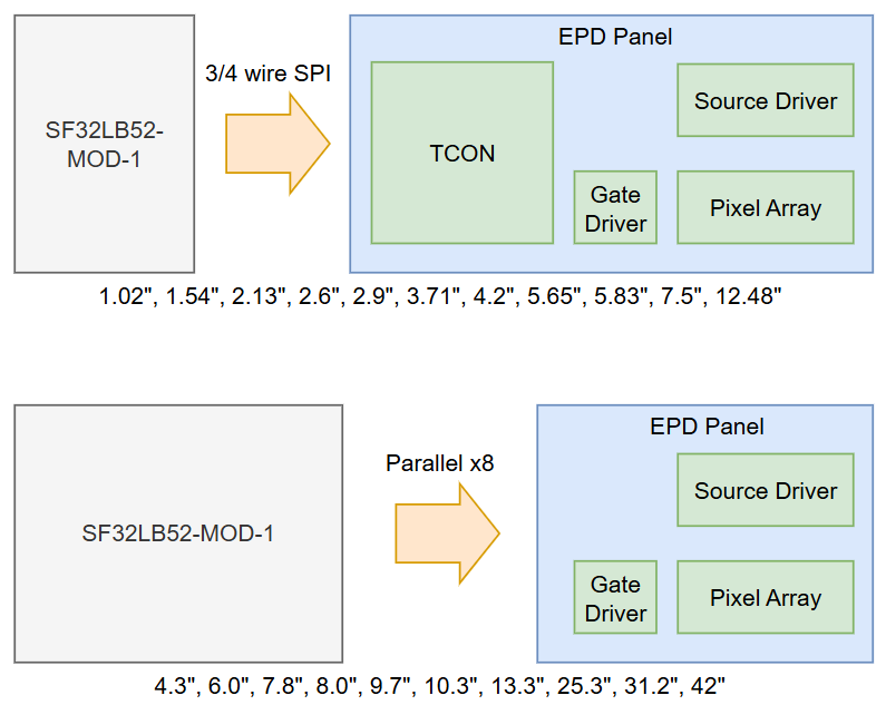 SF32LB52-MOD-1模组的CPU集成了墨水屏的TCON控制模块,可以直接驱动x8数据位宽的并口墨水屏。