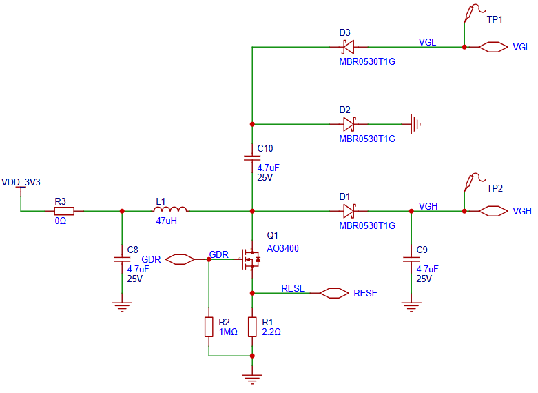 如下图所示,由GDR和RESE来产生VGH和VGL,元器件的具体值请参考屏幕规格书的要求。