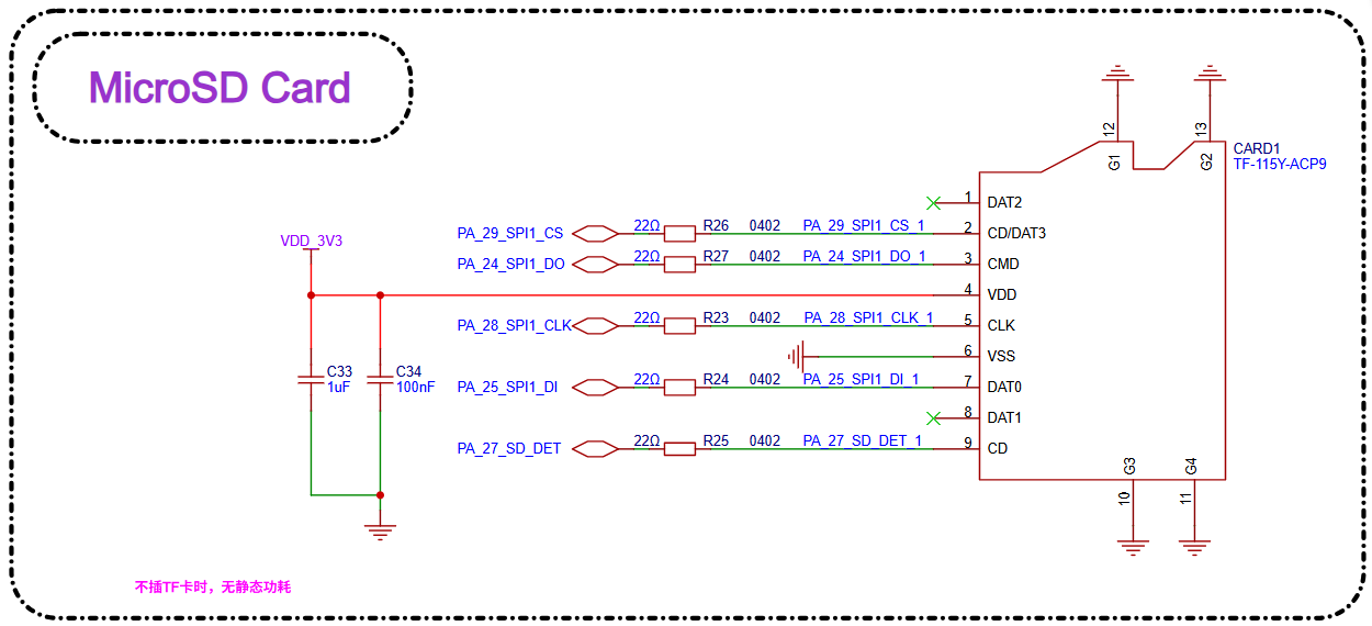 模组支持SPI模式TF卡接口,信号连接方式见下表: